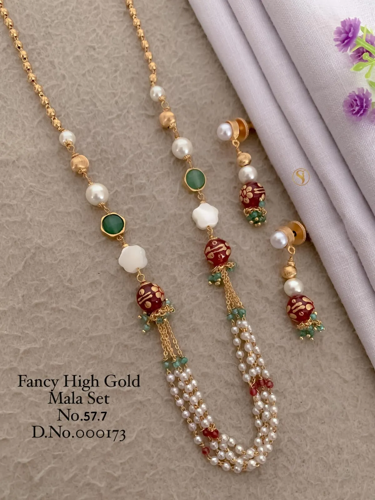 Designer pearl mala set with polished beads and an ethnic floral centerpiece that enhances all festive and cultural outfits with elegance.