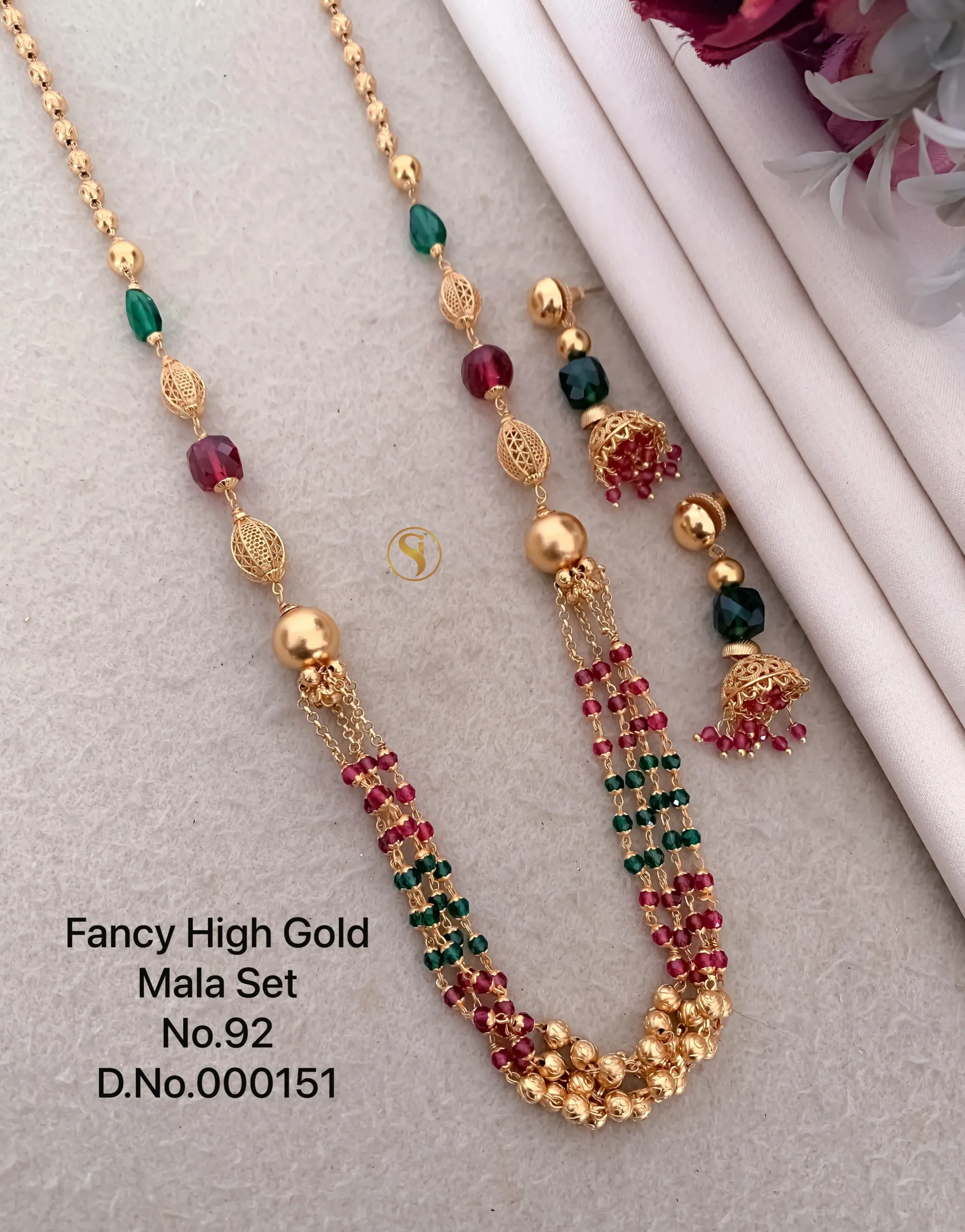 Fancy high gold mala set combining ruby and green beads with multi-layered gold-toned bead chains. This festive design brings richness and traditional charm, making it a perfect accessory for weddings, festivals and cultural events. The matching earrings enhance your complete ethnic look effortlessly.