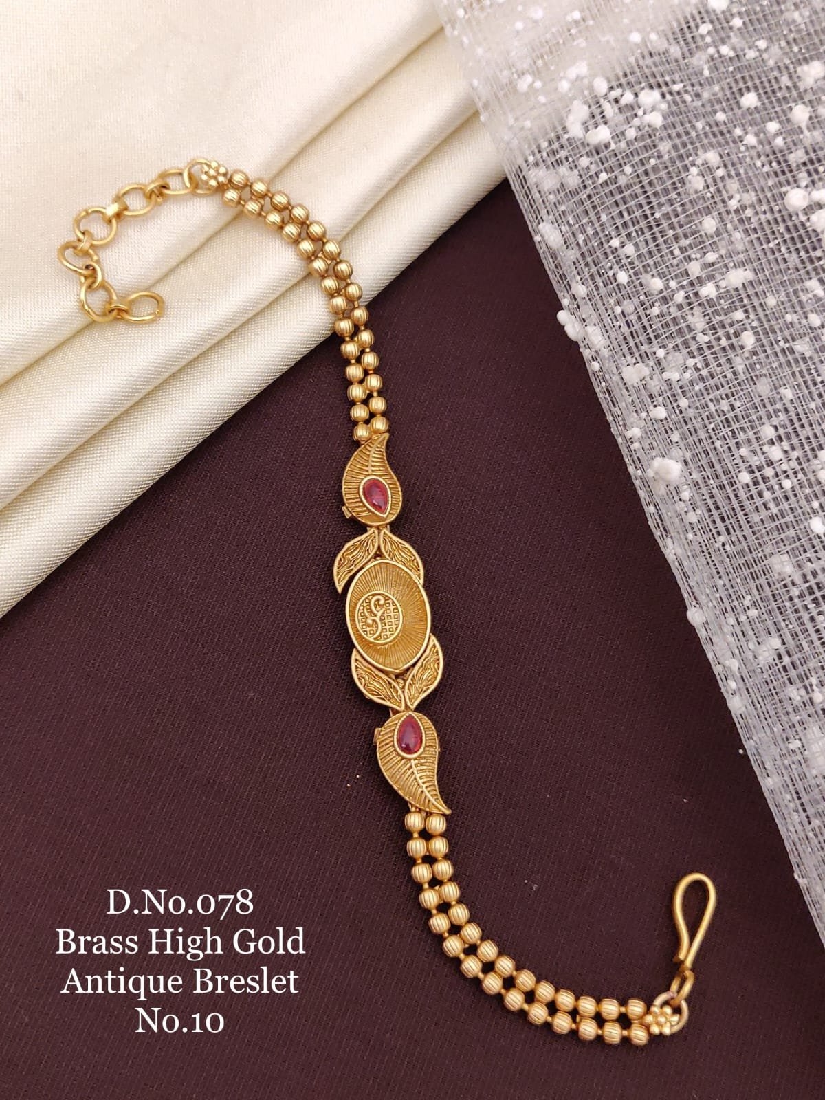 Brass high gold antique designer leaf and ruby bracelet crafted with premium detailing and ruby accents that highlight its traditional elegance. The antique polish enhances the rich ethnic design suitable for weddings, pujas, and festive functions.