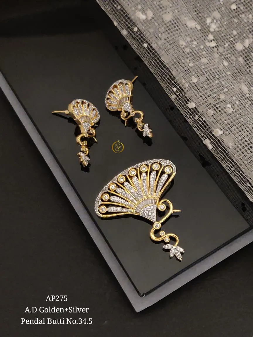 This designer gold AD pendant earrings set features a fan-style motif inspired by traditional elegance blended with modern artistry. The intricate stone details, curved lines, and rich finish make it perfect for festive celebrations, cultural events, and wedding styling. Ideal for women who appreciate unique statement jewelry.