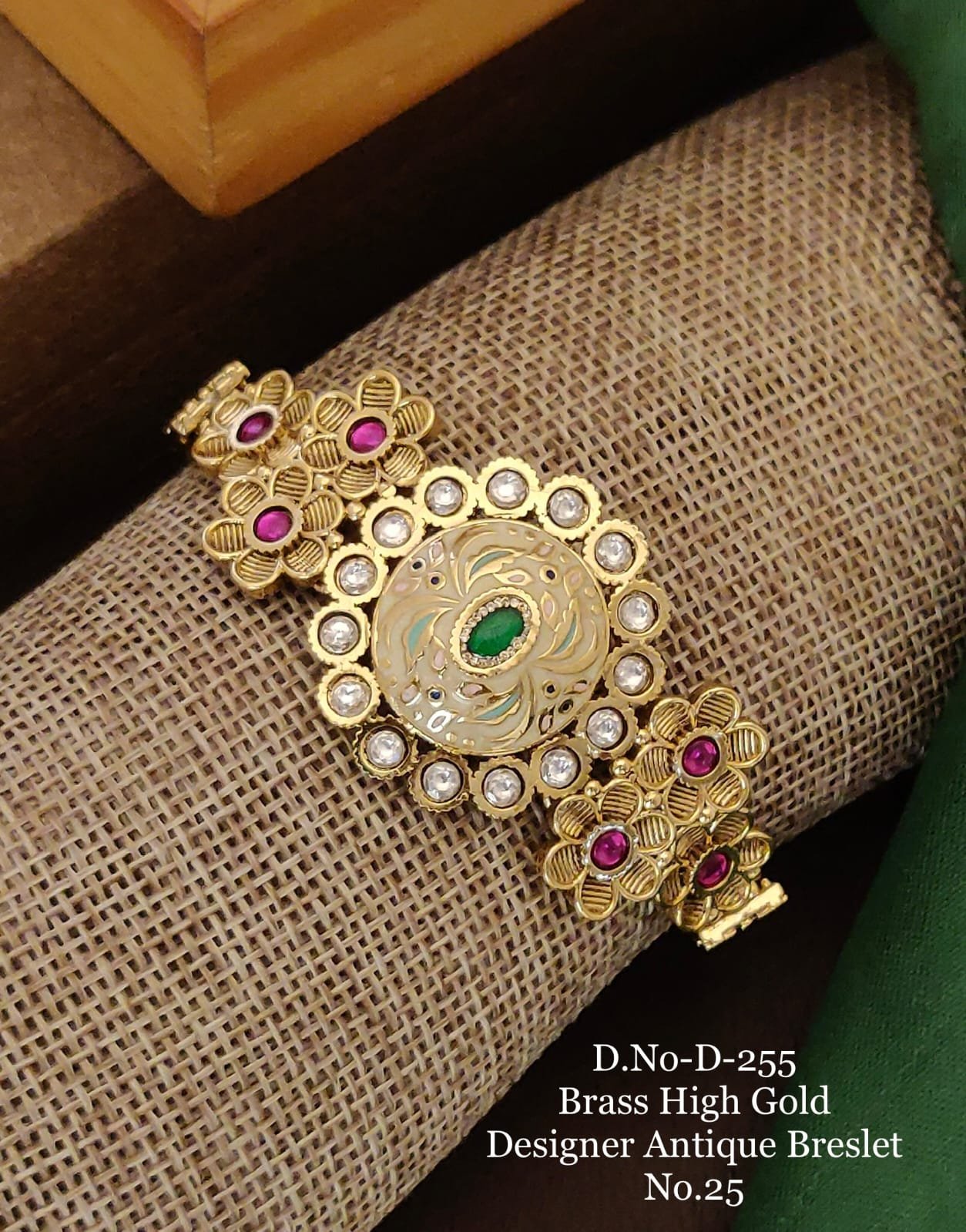 This vintage-inspired bracelet blends floral artistry with premium high-gold polish and vibrant stones. The central round motif paired with delicate enamel work gives it an elegant heritage look. Perfect for festivals, weddings, and cultural occasions where traditional charm is desired.