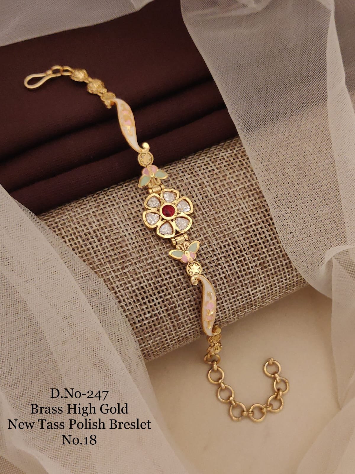 This elegant bracelet blends modern tass polish with floral artistry for a stylish ethnic accessory. The pastel enamel work and red central stone highlight its beauty, making it suitable for festive outfits and traditional occasions.\nWhy You’ll Love It: Lightweight, beautifully detailed, and crafted with precision, this bracelet enhances your ethnic wardrobe effortlessly. The smooth high-gold finish and enamel motifs offer a classy, feminine appeal, making it a timeless addition to your jewellery collection.\nJewelry Care: Avoid contact with water and perfume. Clean with a soft cloth and store separately.|