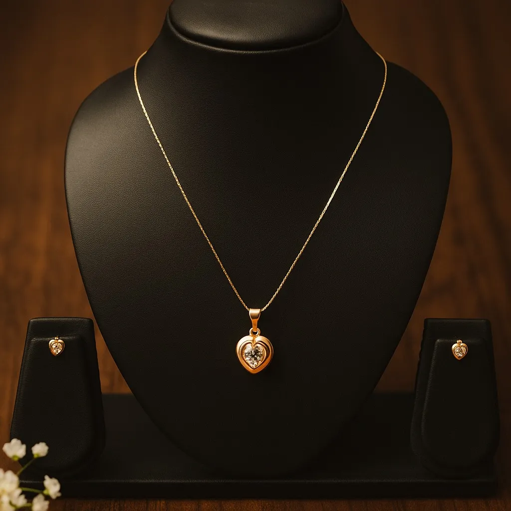This elegant gold plated heart-shaped pendant set features sparkling stone detailing that adds brilliance to your style. The centerpiece pendant is surrounded by a heart outline and paired with matching stud earrings, designed to reflect romance and sophistication. Its lightweight chain ensures comfort, making it suitable for daily styling as well as grand celebrations. The polished golden frame and sparkling stones strike the perfect balance between modern elegance and traditional charm, creating an accessory that works effortlessly for women of all ages. This set is a thoughtful pick for gifting and personal wear.