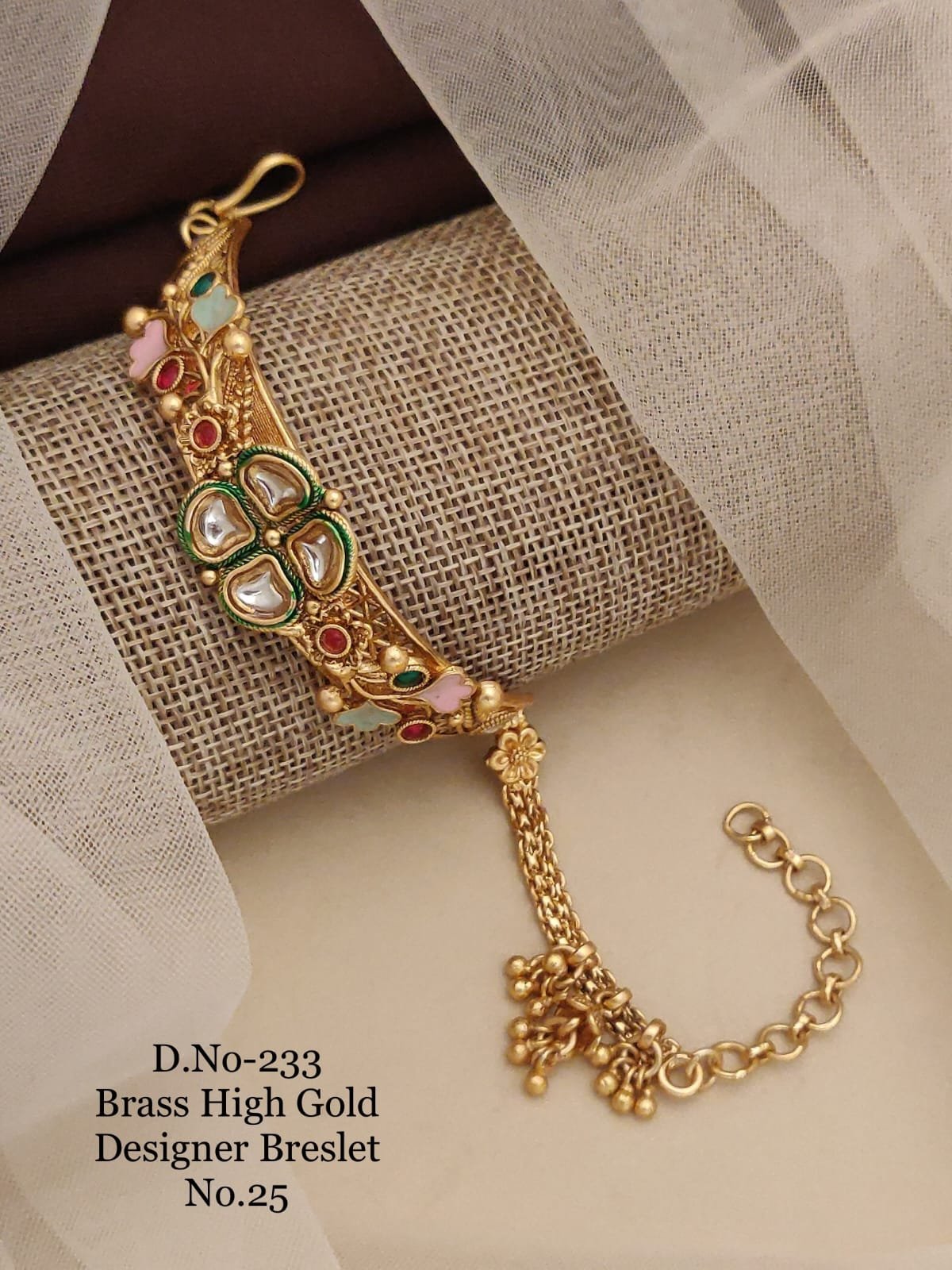 This designer bracelet features floral motifs, enamel work, and a high-gold antique finish, making it a luxurious ethnic accessory. Its detailed craftsmanship enhances festive and traditional looks effortlessly. |Details: The bracelet showcases intricate artistry, premium shine, and perfectly placed stones that elevate any outfit. Its adjustable fit and elegant structure make it ideal for celebrations, wedding events, or cultural gatherings. |Jewelry Care: Avoid water exposure and perfumes. Wipe after use and store in a soft pouch.