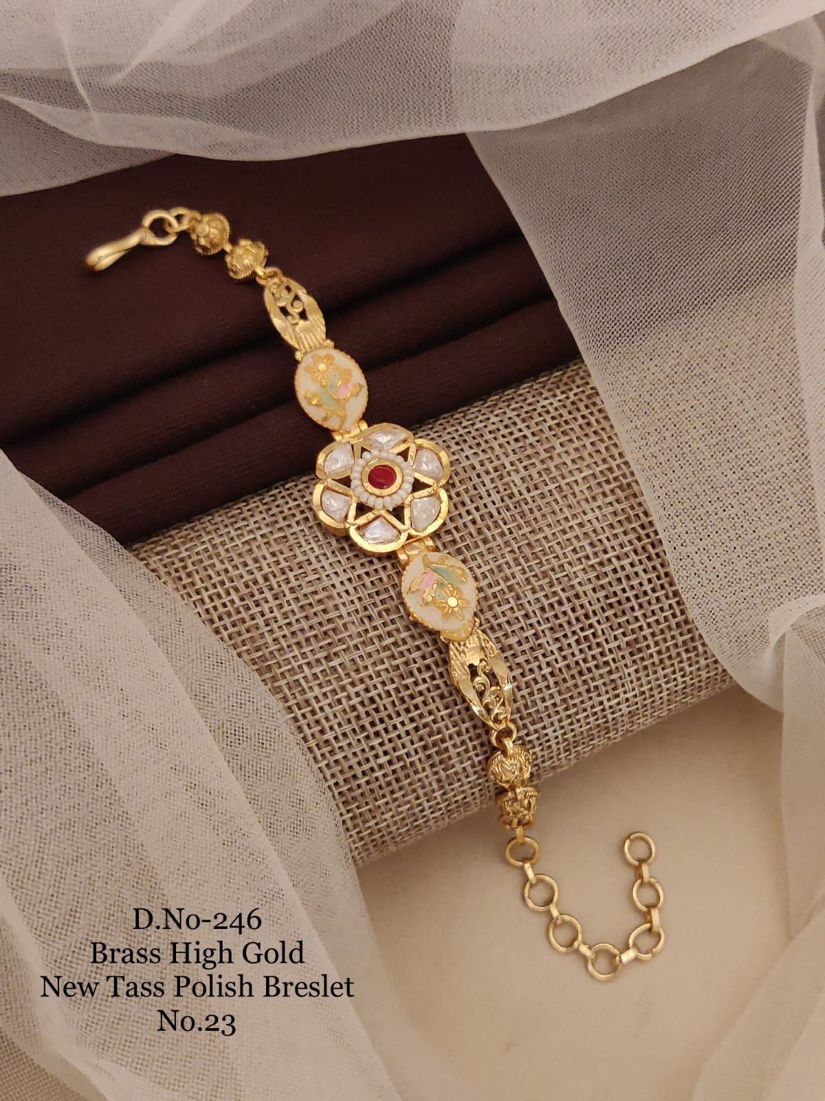 This beautifully designed bracelet features oval enamel motifs paired with a floral centerpiece that exudes elegance and charm. Its high-gold tass polish adds richness, making it perfect for festive events.\nWhy You’ll Love It: The bracelet’s craftsmanship blends fine detailing, premium polish, and comfortable wear. It pairs seamlessly with traditional outfits, enhancing your festive look with subtle sophistication.\nJewelry Care: Avoid moisture and harsh products. Wipe gently and store in an airtight pouch.|