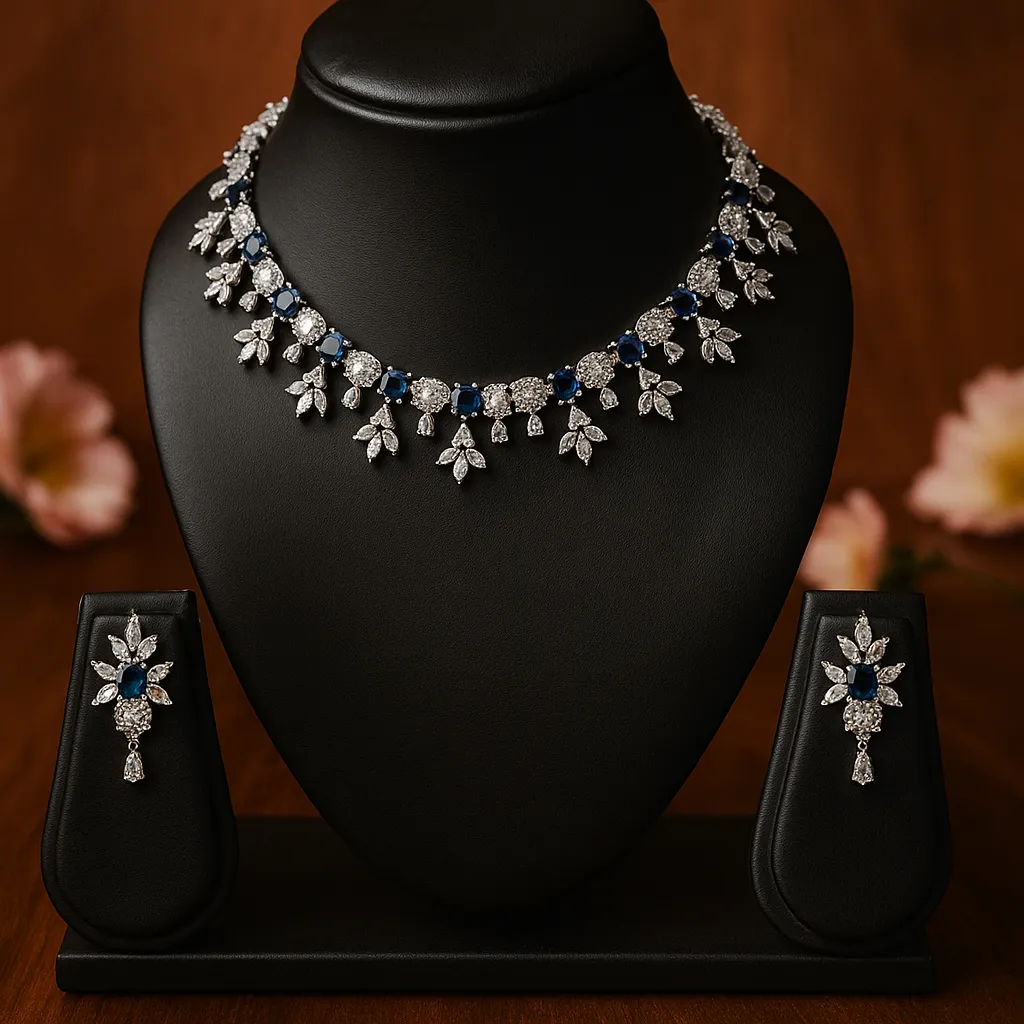 Royal navy blue sapphire and diamond necklace set crafted with precision stones for elegant evening and bridal looks.|Details:|- Metal: Silver + alloy with Premium Polish|- Closure: adjustable|- SKU Code: FMSNCLS0 (2)