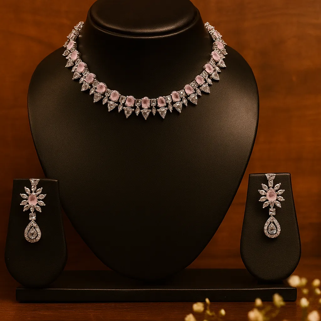 A pink stone diamond necklace set designed with soft blush gemstones encased in shimmering silver. The radiant teardrop diamonds reflect an ethereal glow, giving the perfect blend of romance and elegance for special occasions.