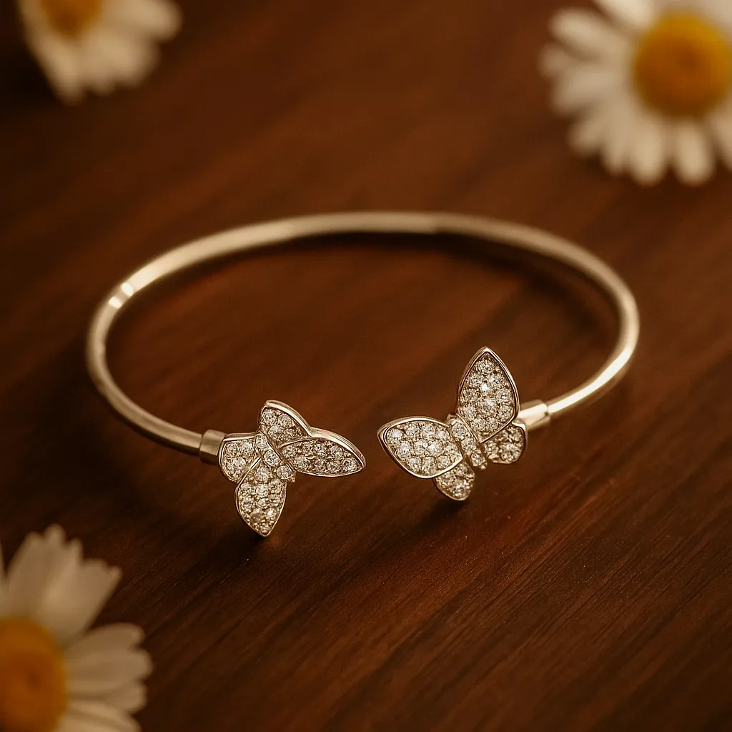 Inspired by nature’s beauty, this twin butterfly bracelet symbolizes grace and transformation. Each butterfly wing is encrusted with sparkling white stones, glistening with every move. The openable silver frame adds a touch of refinement, making it perfect for parties, brunches, and everyday glam. Lightweight yet luxurious, it’s elegance in motion. Loved for its whimsical charm, it adds a feminine touch to every outfit while embodying freedom and beauty. Its shimmering crystal details enhance radiance, making it an ideal gift or self-indulgence piece. Elegant, modern, and delicate — this bracelet captures timeless appeal. Keep away from perfume and moisture. Clean with a soft dry cloth and store safely after each wear.|